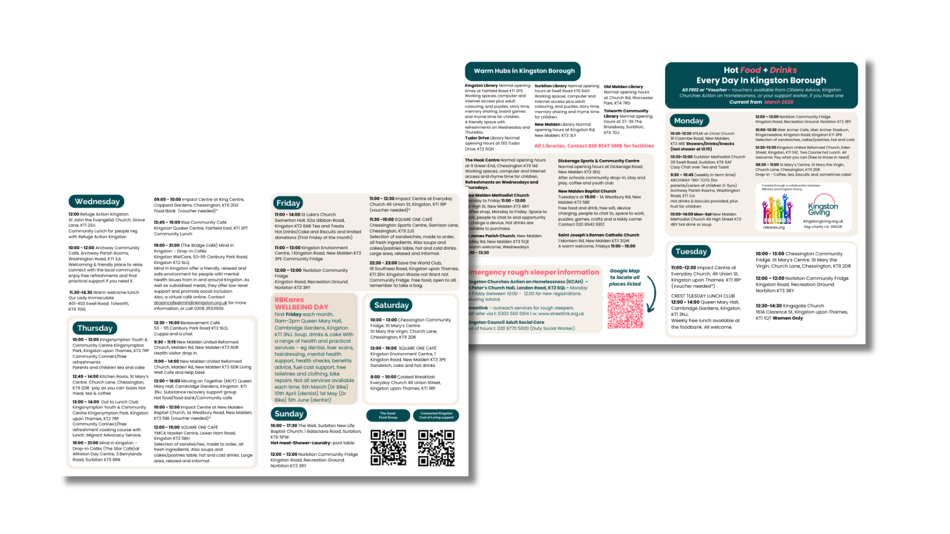 To make it easier to see what’s available, RBKares and Kingston Giving have collaborated to produce a simple guide showing where people can find food, refreshments and warm spaces throughout the week.